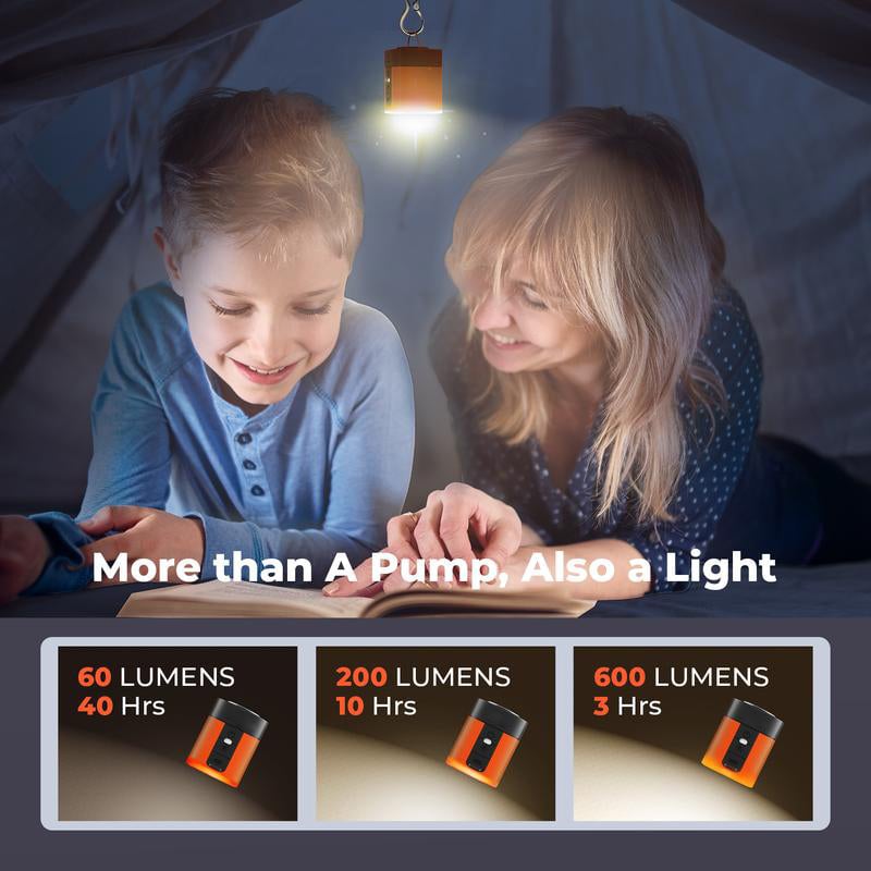 - 600 LUMENS CAMPING LIGHT: Beyond an air mattress pump, the Mini Air Pump has a much brighter LED Light. It offers three modes for different purposes: soft light of 60 Lumens, reading light of 200 Lumens, and outdoor light of 600 Lumens.
