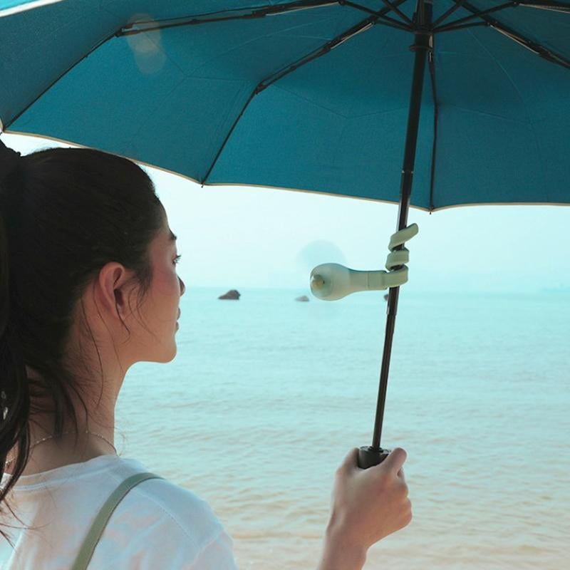 With flexible legs under the fan which could allow you to secure the fan to your wrist, the umbrella handle. It also can be used as a desktop air fan or handheld fan on your desk. keep your body cool at any time!