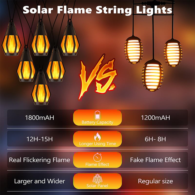 Auto on/off solar powered outdoor lights: These solar patio lights are solar-powered and energy-efficient, with no extra utility electric cost and no need to replace the battery. The light sensor controls the solar flame string lights, which charge under sunlight and automatically light up at dusk or in darkness. Just turn on the switch and put it in the sunlight. It will take 6-8 hours to fully charge.