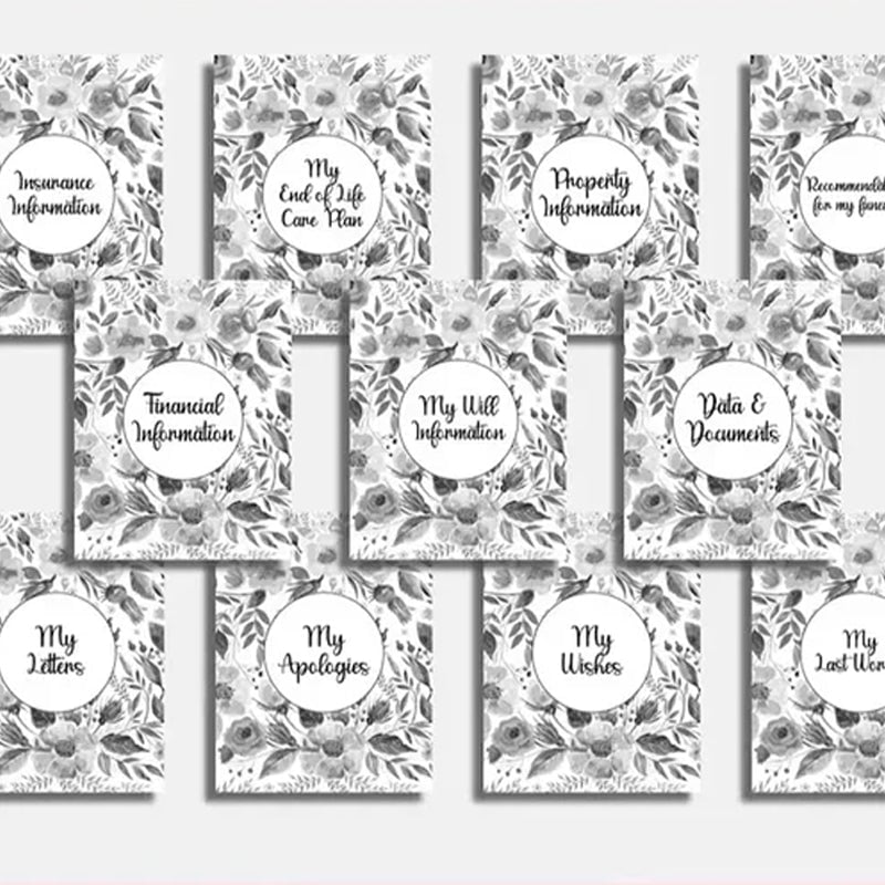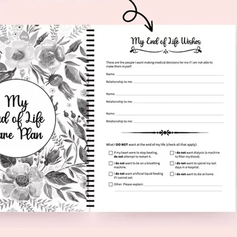 Our thorough and funny End of Life Planner covers everything your family and/or friends will need to know upon your passing or incapacitation.... from Financial Information to Insurance Information to End Of Life Care Wishes and more!